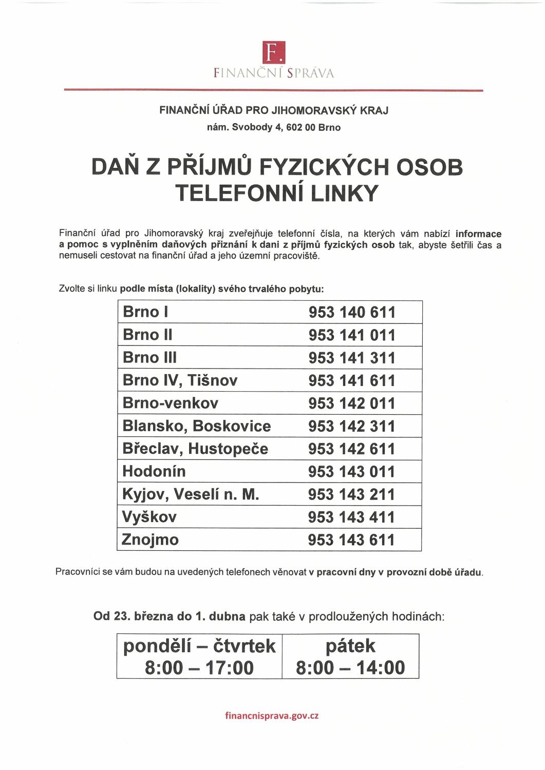 Infolinky pro dotazy k dani z příjmu fyzických osob budou v provozu v pracovní době úřadu a od 23. března do 1. dubna také v prodloužených hodinách (pondělí - čtvrtek od 8 do 17 hodin a v pátek od 8 do 14 hodin).